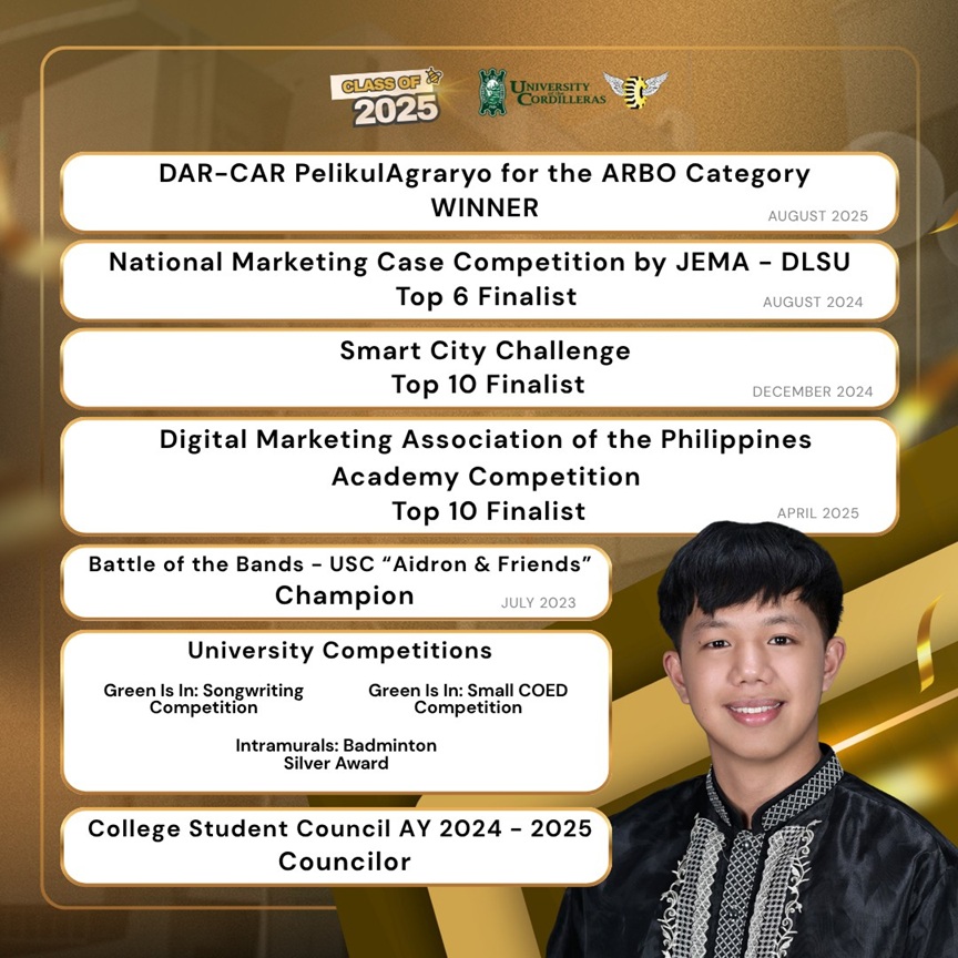 The University of the Cordilleras College of Business Administration (UC CBA) proudly celebrates the outstanding achievements and holistic involvement of Aidron Jeav U. Golocan, a BSBA Major in Digital Marketing graduate (Class of 2025).